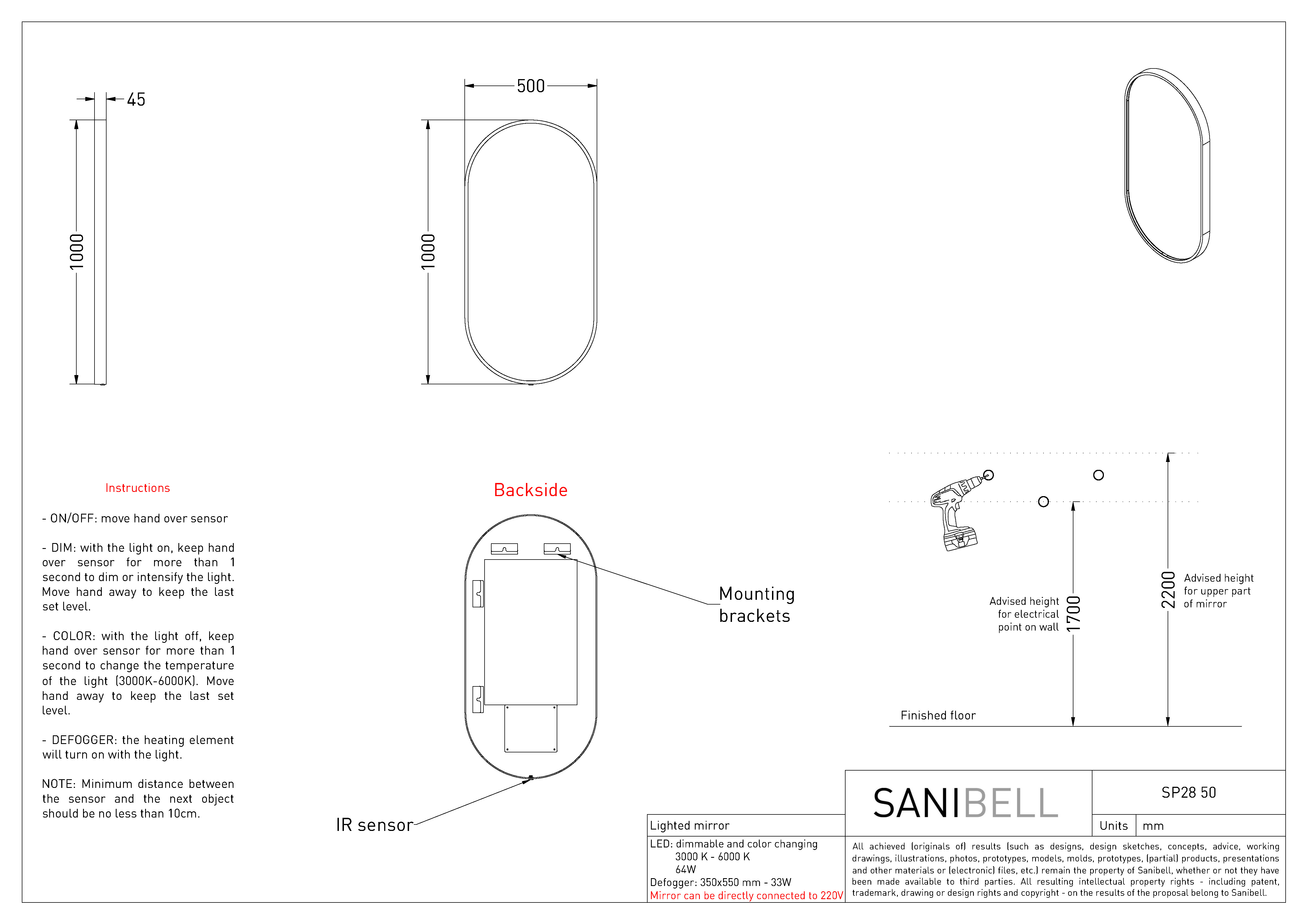 Sanibell Ink SP28 ovalt spejl m/lys, varme og sensor 50 x 100 cm - Mat sort Charmerende ovalt spejl fra Sanibell Ink. Dette badeværelsesspejl har LED-lys indbygget i rammen, så du opnår et godt, jævnt lys. Selve lysets farvetemperatur kan ændres, så det passer placering, klokkeslet eller behov. Spejlet har desuden indbygget varme, hvilket betyder, at du kan nyde et dugfrit spejl, selvom du har nydt et langt og varmt bad. Dette spejl fås i 6 flotte farvevarianter, så det kan matches perfekt med resten af badeværelset. Specifikationer: